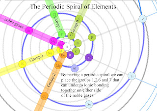 Also by having a periodic spiral we place the groups of elements that can undergo Ionic bonding together on either side of the noble gases,